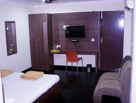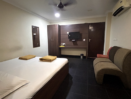 The room is thoughtfully furnished with a large double bed, quality bedding, wardrobe, study area, and a 32-inch LED TV. The air conditioner ensures a pleasant room temperature throughout the year, and the attached bathroom features round-the-clock hot water. With daily housekeeping and room service on hand, the Double Bed Room at Masafi Residency offers genuine comfort at a price that won’t surprise you.