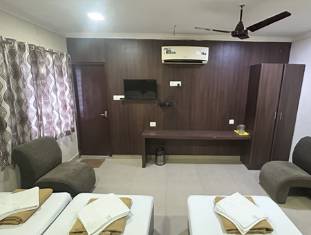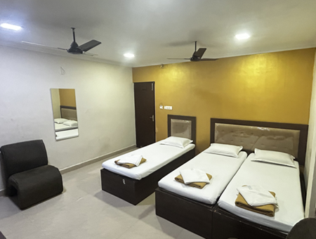 The Triple Bed Room is Masafi Residency’s most spacious room option — ideal for groups of three travelling together or three individuals sharing accommodation for cost efficiency. Thoughtfully laid out to accommodate three guests without feeling cramped, this room is particularly popular among students seeking affordable group PG arrangements and families visiting Chennai together.
