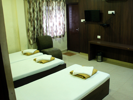 Three individual beds are provided with fresh linen, along with shared wardrobe space, a study desk, and a 32-inch LED TV. The room’s air conditioning and hot water supply ensure that all three guests stay comfortable, while the included complimentary breakfast means you start every morning well-fed and ready for the day. Housekeeping visits daily, so the room is always clean and well-maintained.